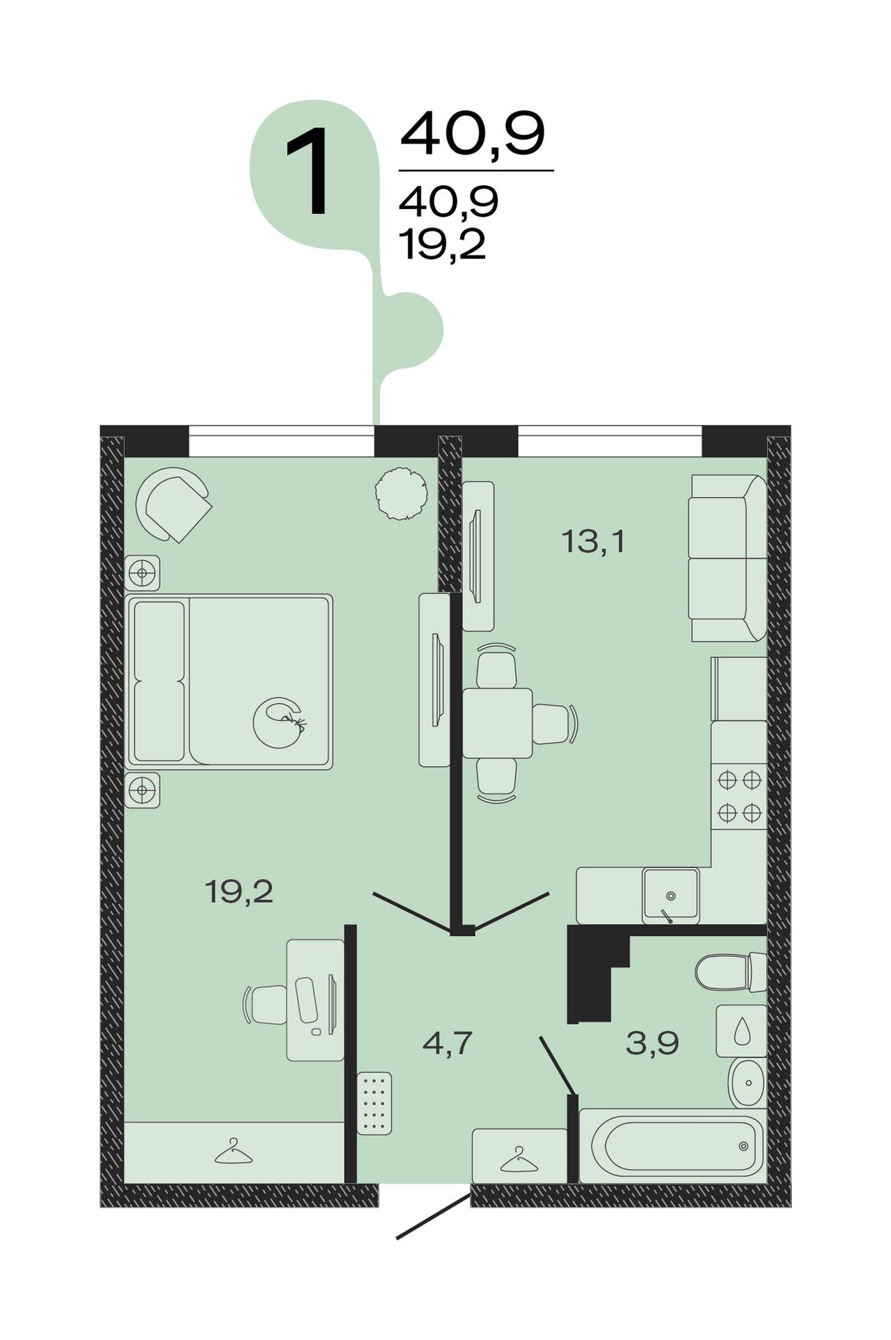 1-комнатная — 40,9 м² 3/4 эт. в ЭВО