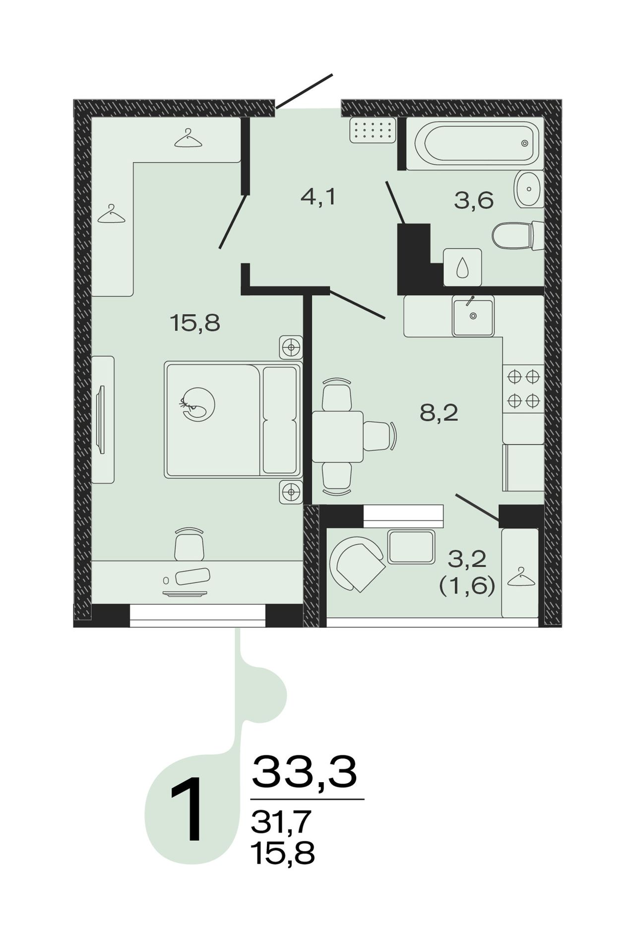Жилая площадь15,8 м²