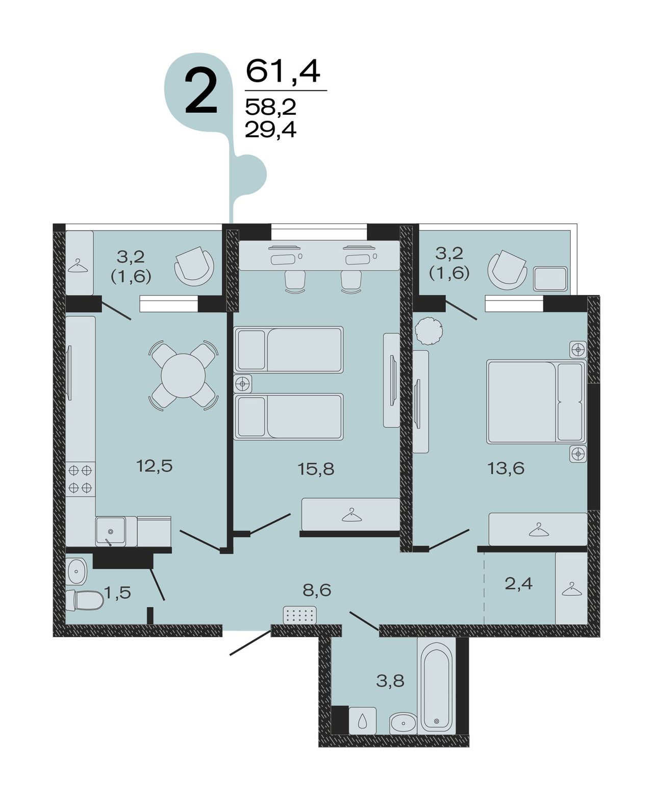 2-комнатная — 61,4 м² 1/4 эт. в ЭВО