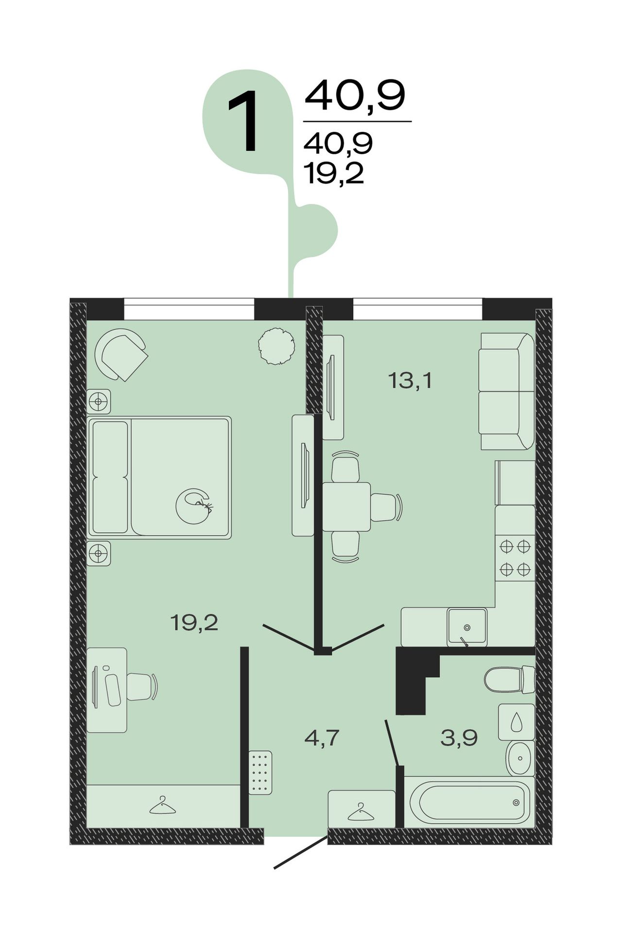 1-комнатная — 40,9 м² 2/4 эт. в ЭВО
