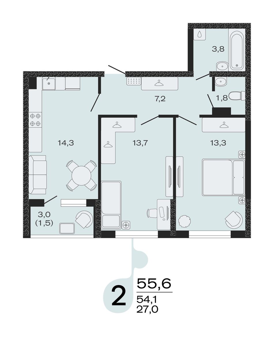 2-комнатная — 55,6 м² 2/4 эт. в ЭВО