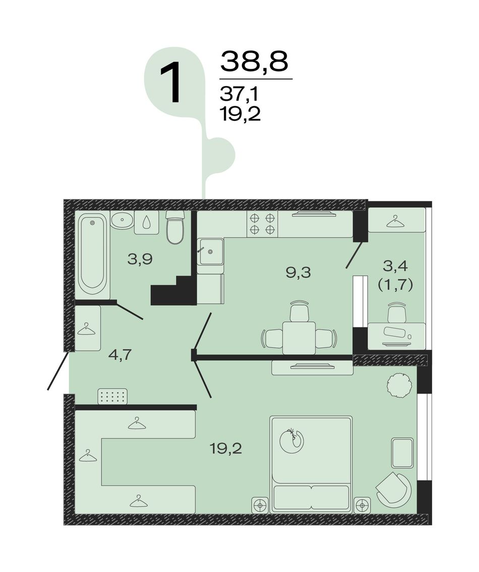 1-комнатная — 38,8 м² 2/4 эт. в ЭВО