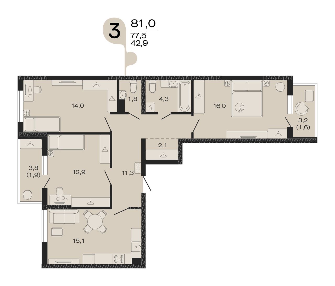3-комнатная — 81 м² 3/4 эт. в ЭВО