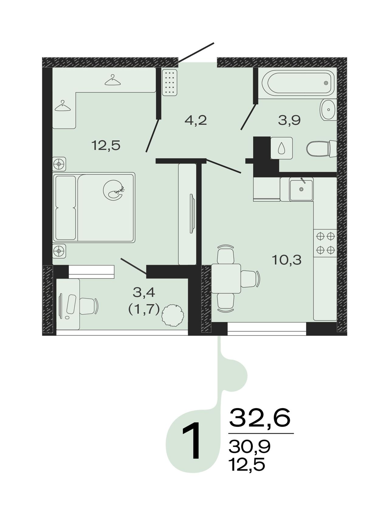 1-комнатная — 32,6 м² 4/4 эт. в ЭВО