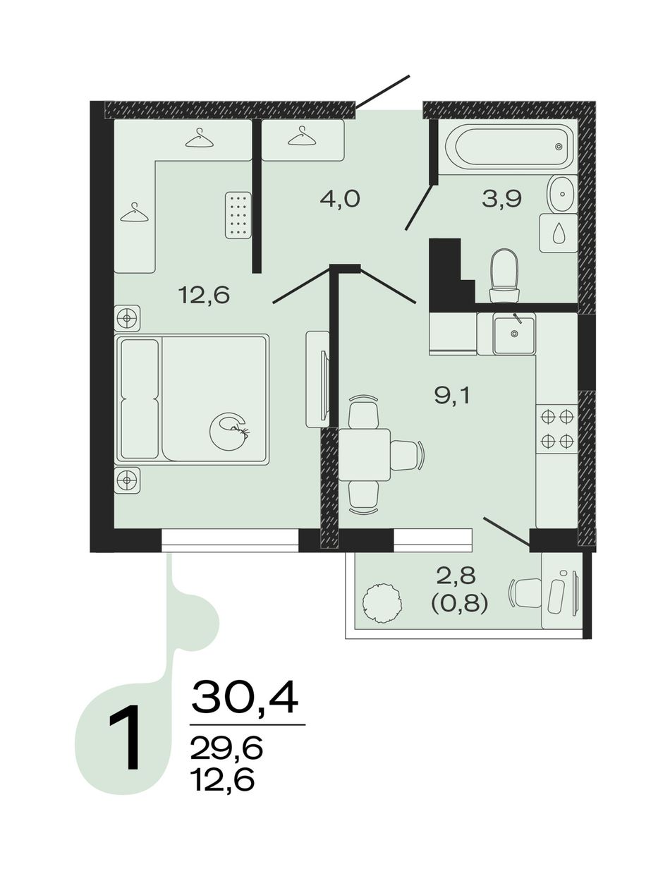1-комнатная — 30,4 м² 4/4 эт. в ЭВО