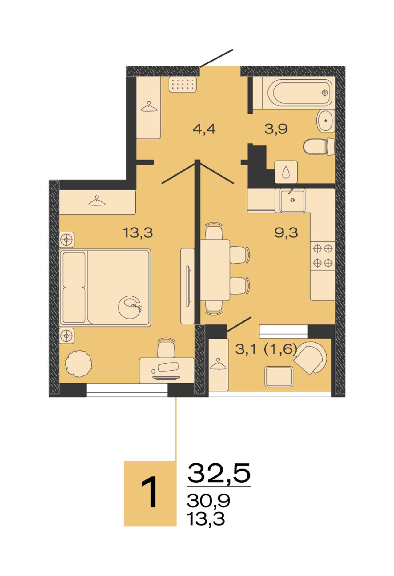 1-комнатная — 32,5 м² 1/4 эт. в Дзенпарк