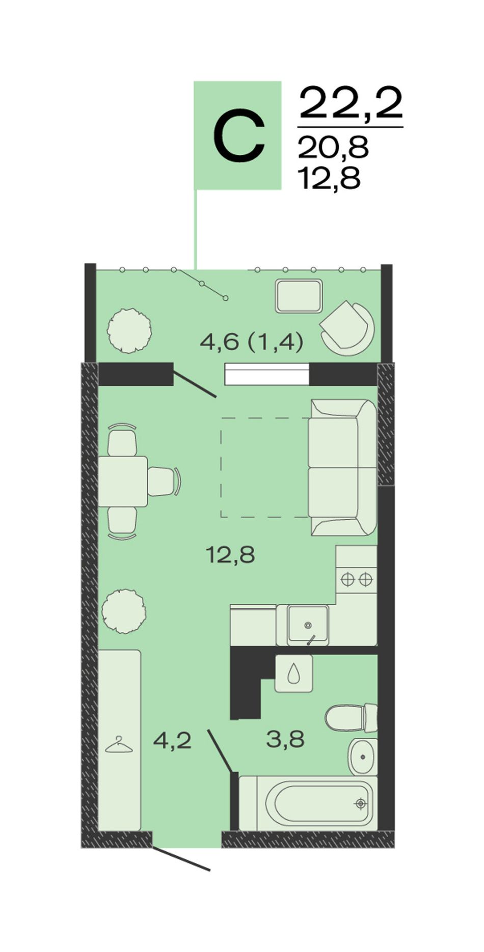 Студия — 22,2 м² 1/4 эт. в Дзенпарк