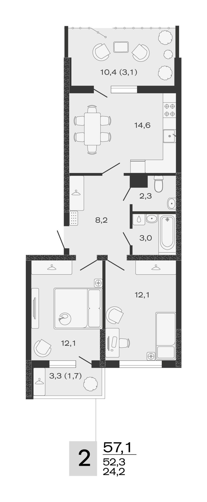 Общая площадь57,1 м²