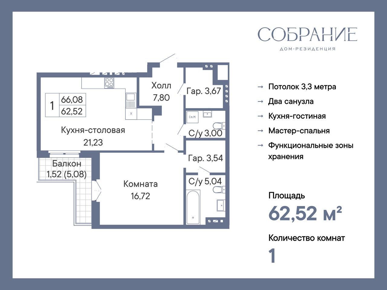 1-комнатная — 62,52 м² 5/7 эт. в Дом-Резиденция Собрание