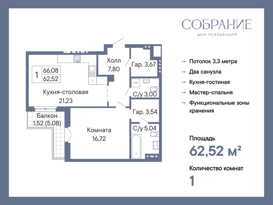 1-комнатная — 62,52 м² 6/7 эт. в Дом-Резиденция Собрание