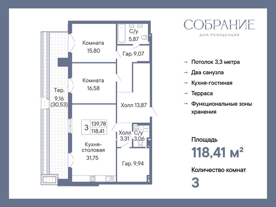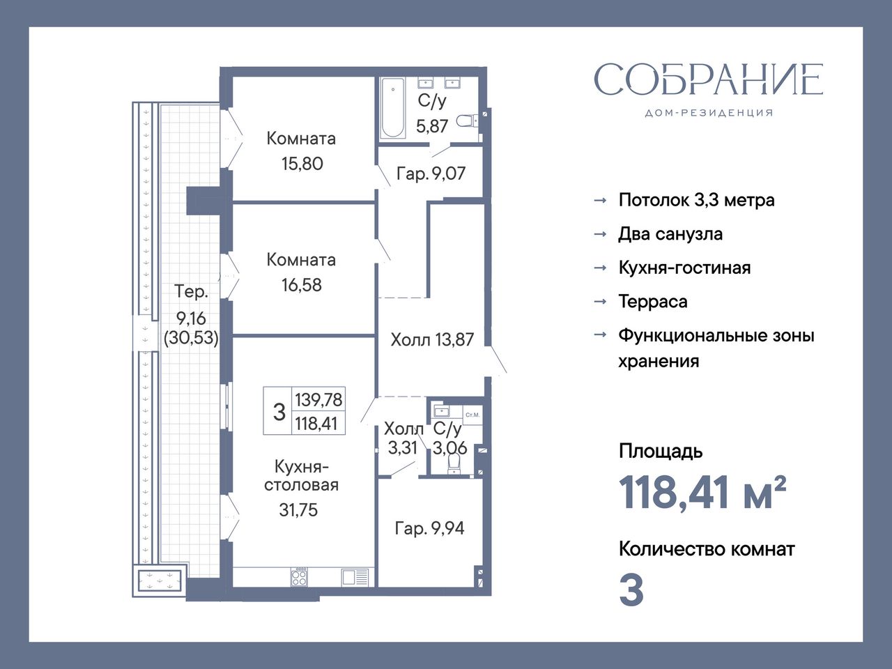 3-комнатная — 118,41 м² 1/7 эт. в Дом-Резиденция Собрание