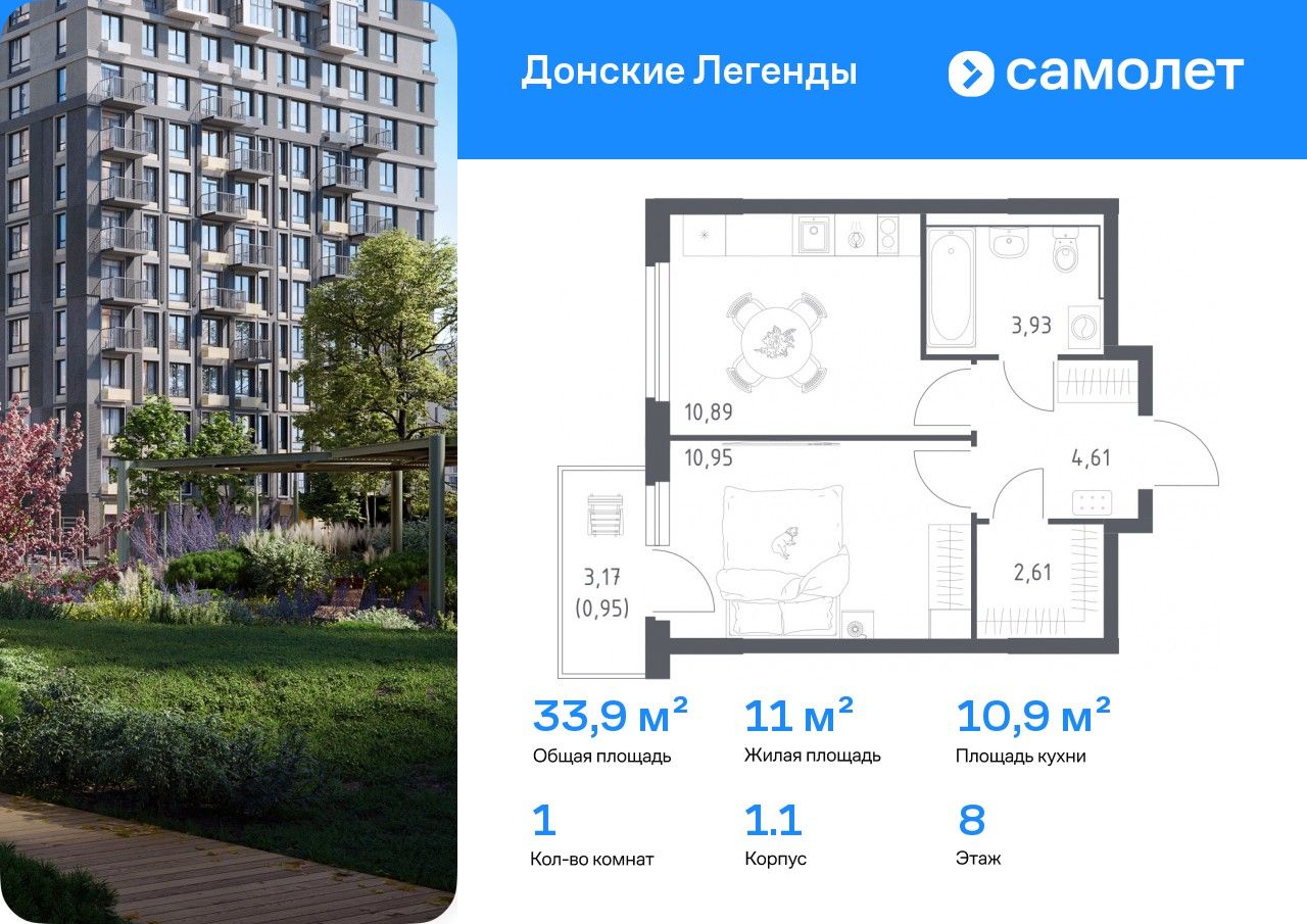 1-комнатная — 33,94 м² 8/15 эт. в Донские легенды