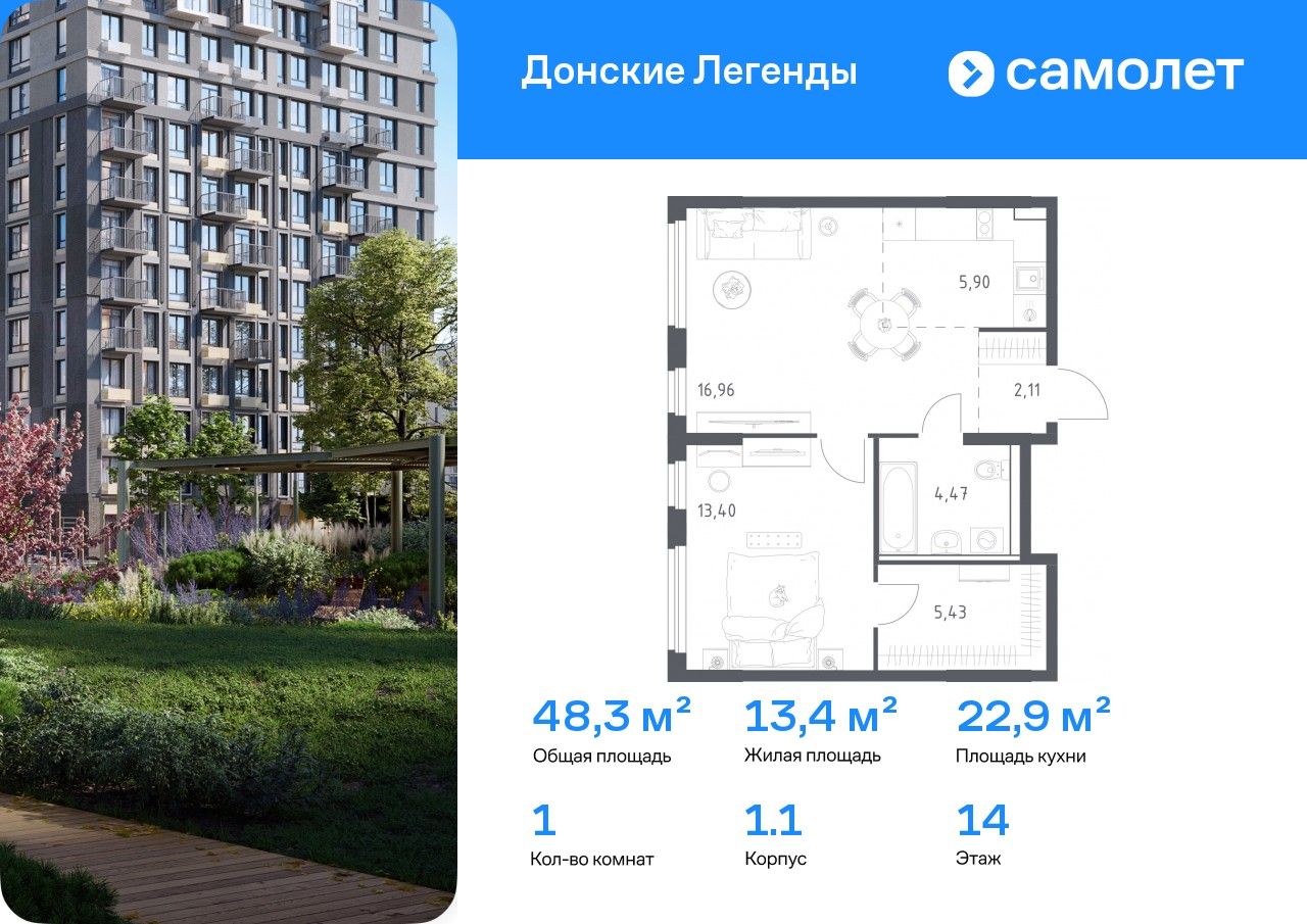 Предлагается 1-комнатная квартира комфорт-класса 48,27 кв.м в корпусе 1.1 на 14 этаже, в ЖК «Донские Легенды»