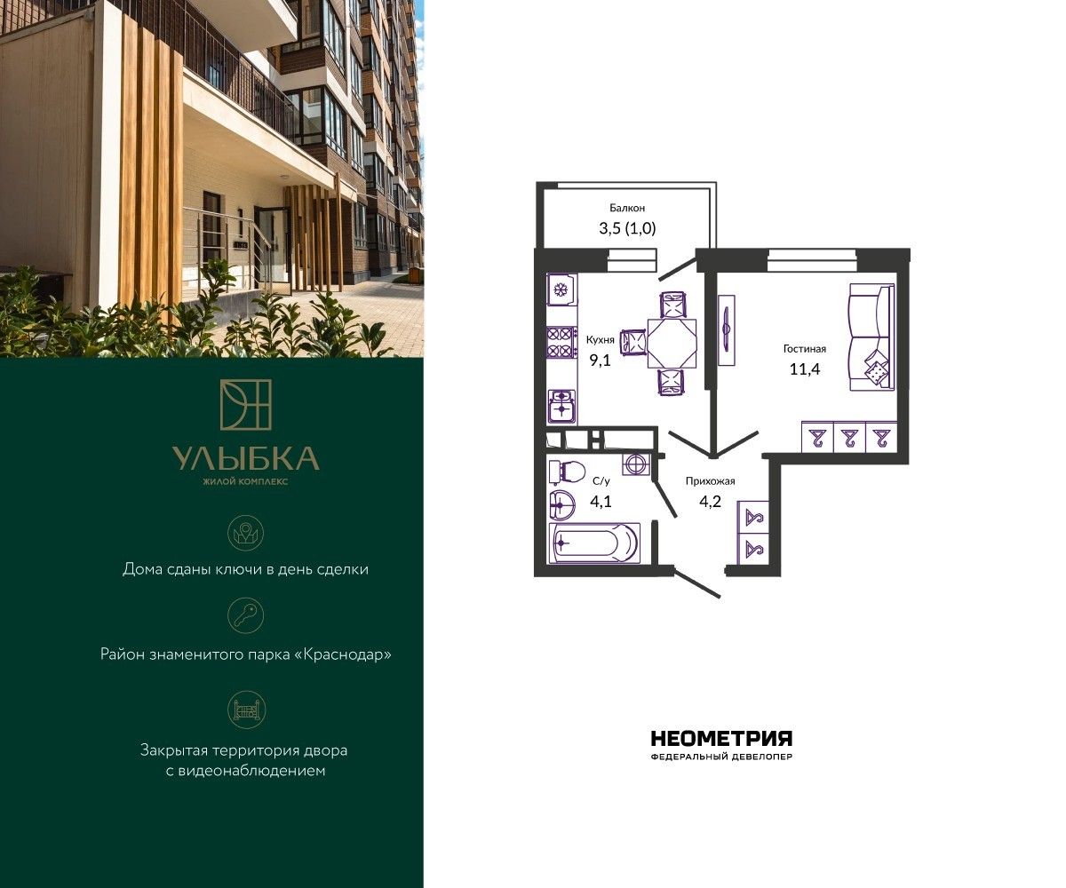 Продается квартира в жилом комплексе «Улыбка» от федерального девелопера «Неометрия». Все дома сданы, ключи в день сделки.