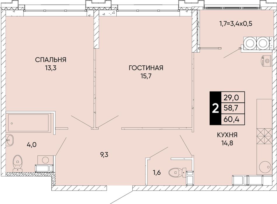 2-комнатная — 60,4 м² 21/24 эт. в Левобережье