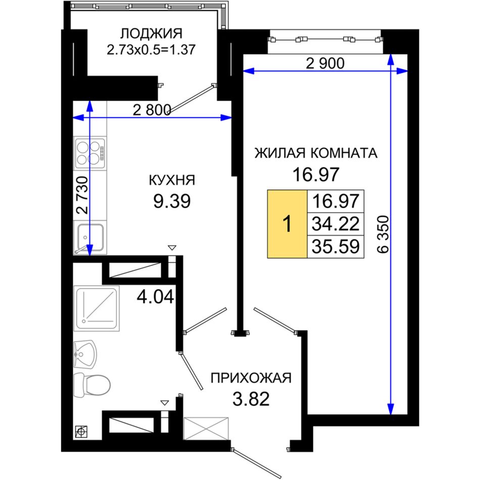 Общая площадь35,59 м²