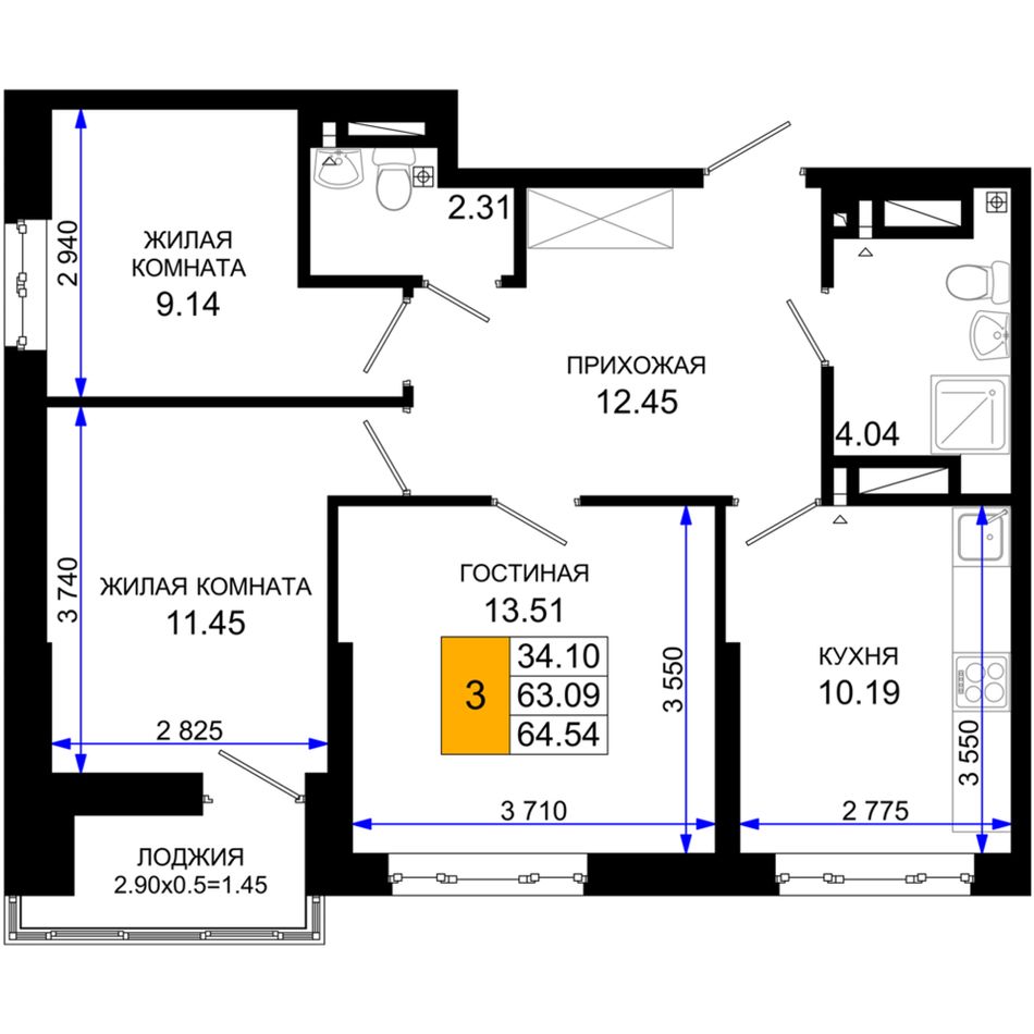 3-комнатная — 64,54 м² 20/25 эт. в Октябрь Парк