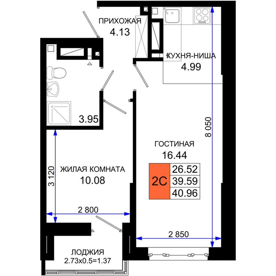 Общая площадь40,96 м²