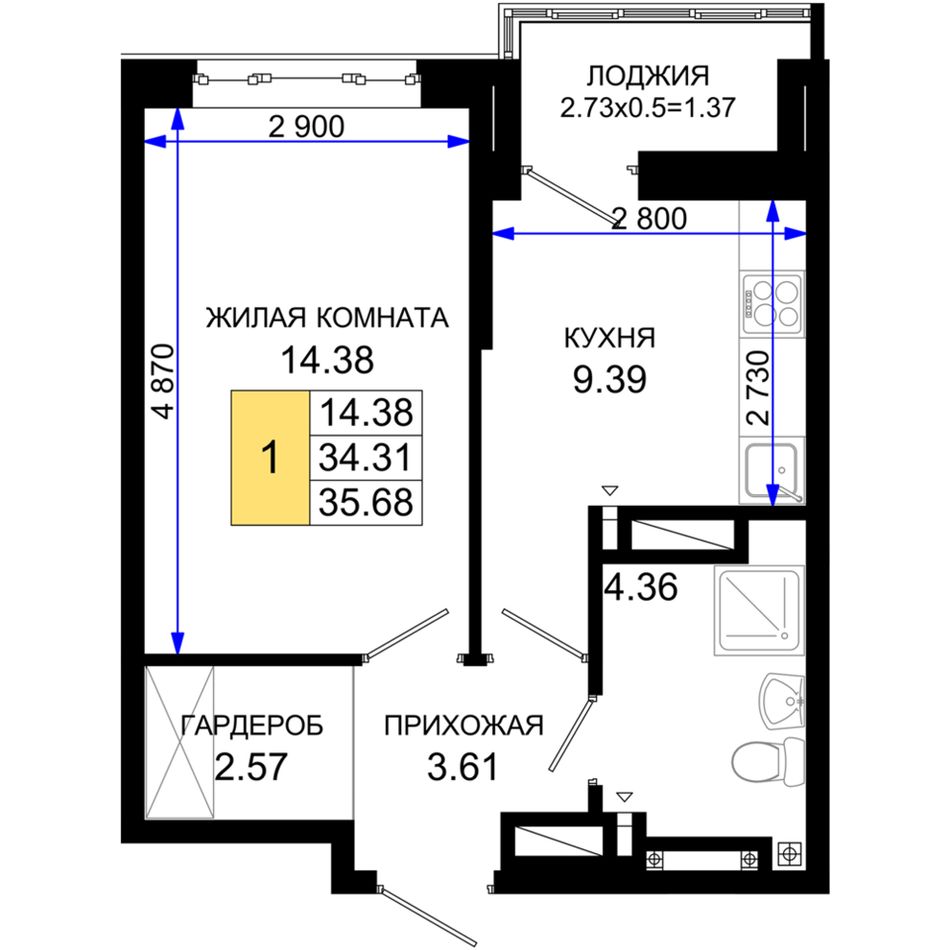 1-комнатная — 35,68 м² 20/25 эт. в Октябрь Парк