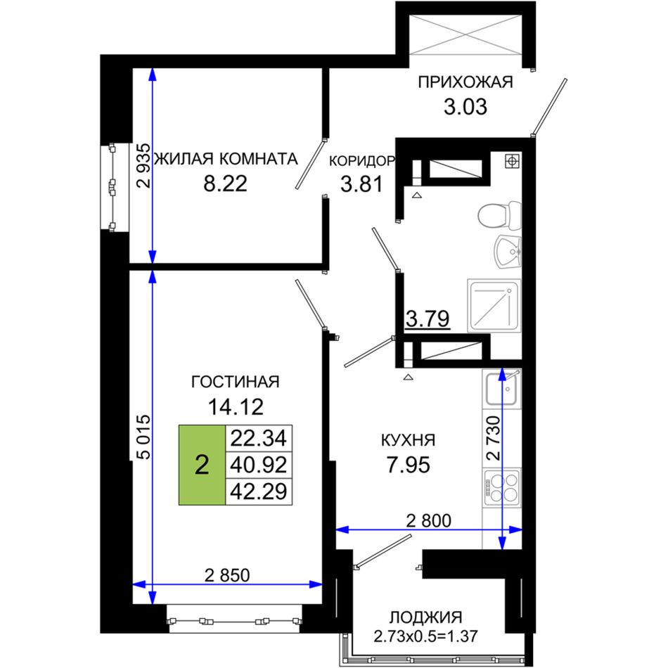 2-комнатная — 42,29 м² 5/25 эт. в Октябрь Парк