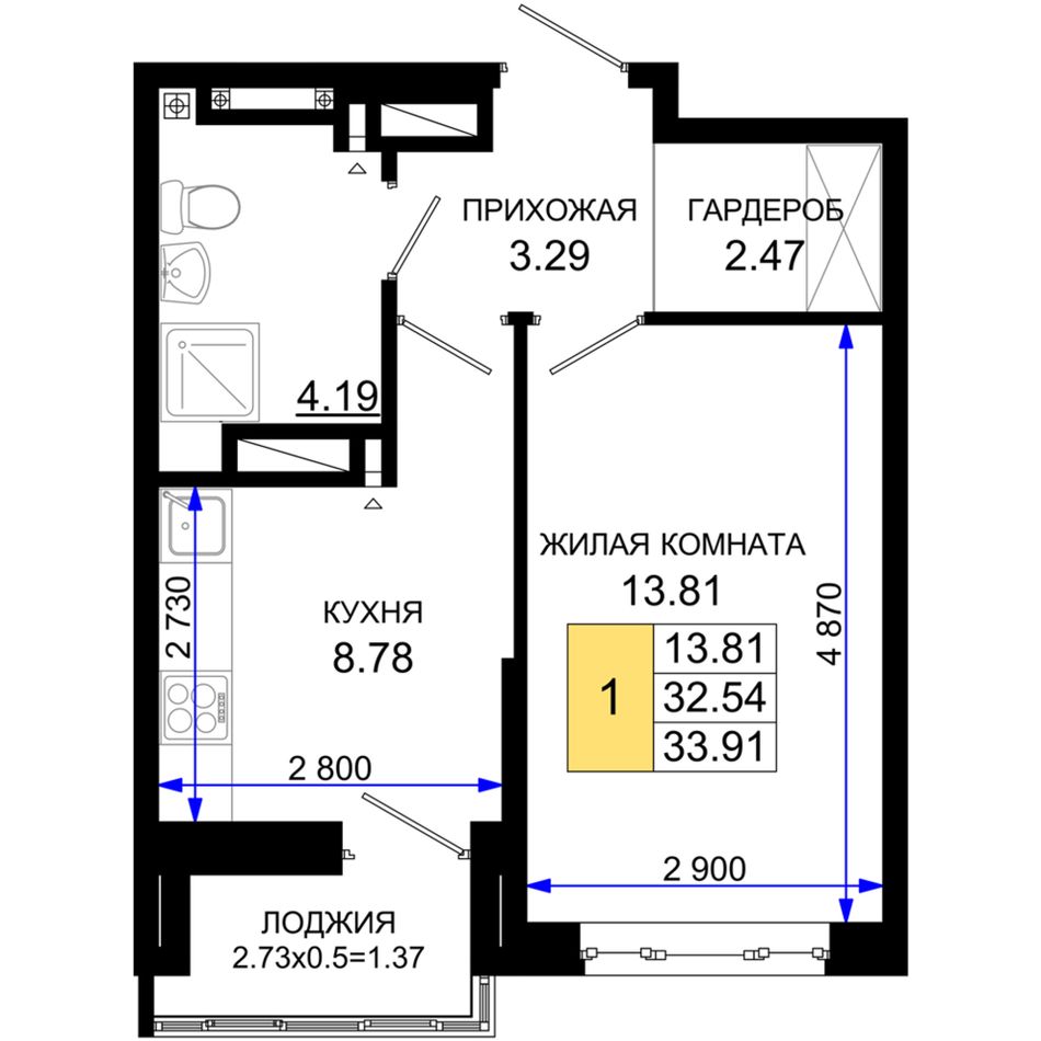 1-комнатная — 33,91 м² 18/25 эт. в Октябрь Парк
