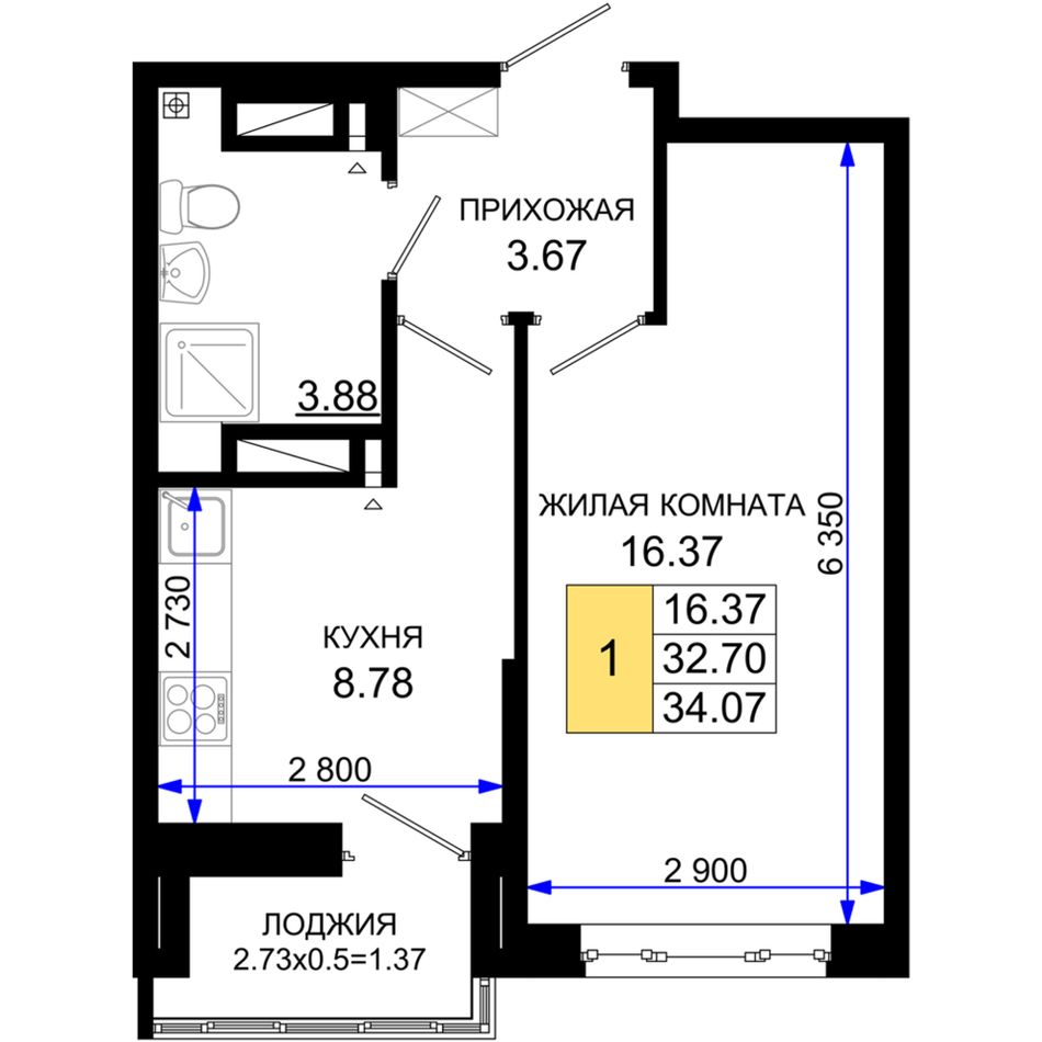 1-комнатная — 34,07 м² 20/25 эт. в Октябрь Парк