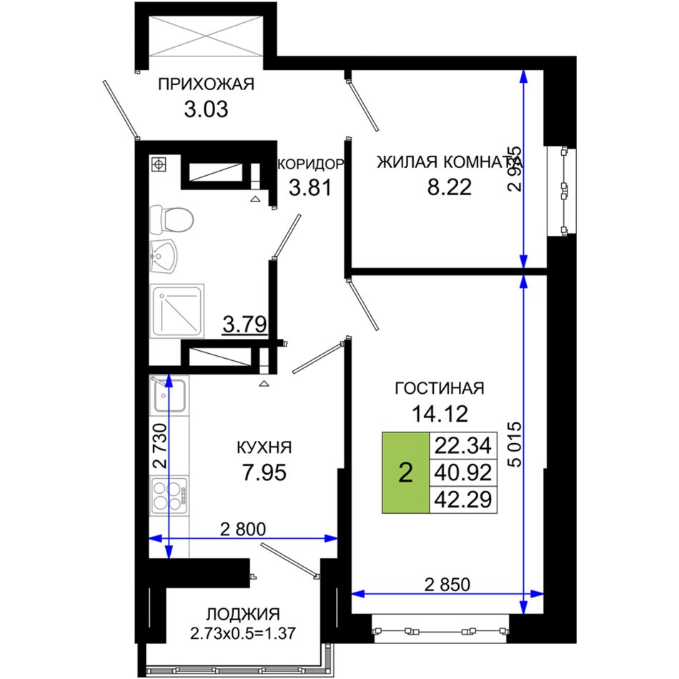 2-комнатная — 42,29 м² 23/25 эт. в Октябрь Парк