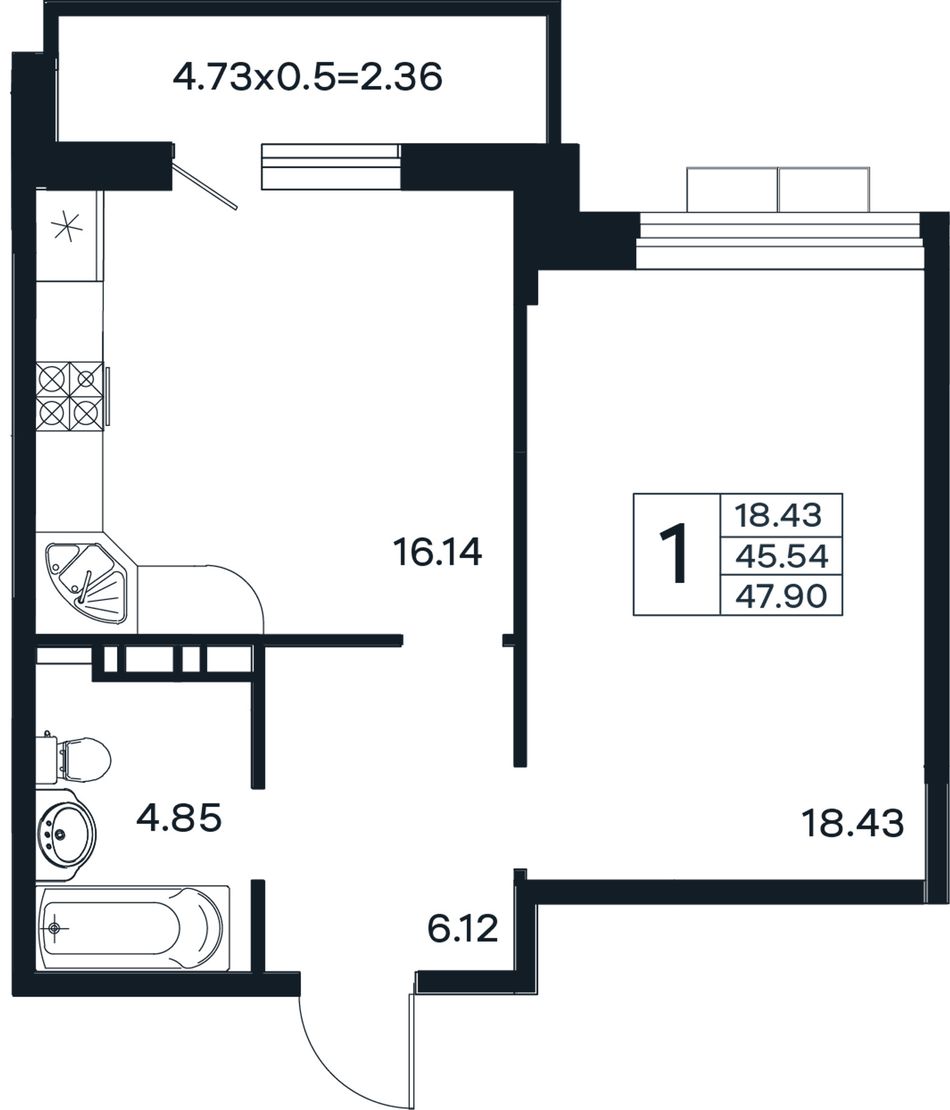 1-комнатная — 47,91 м² 9/12 эт. в ЭНДЕМИК