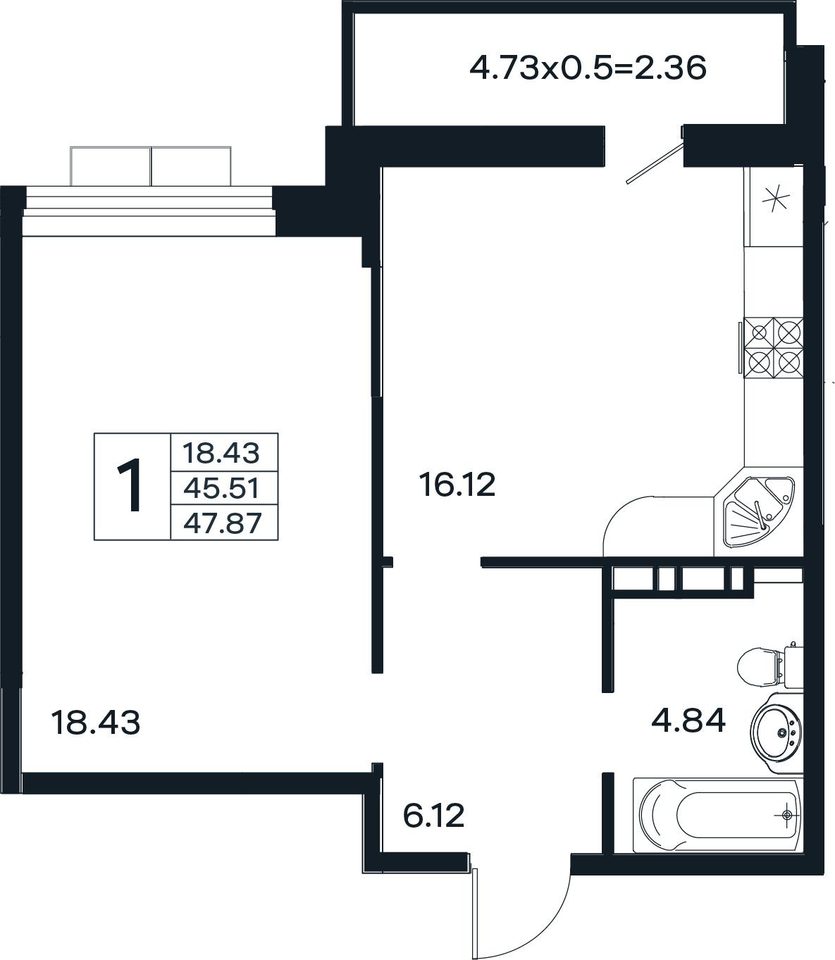 1-комнатная — 47,87 м² 12/12 эт. в ЭНДЕМИК