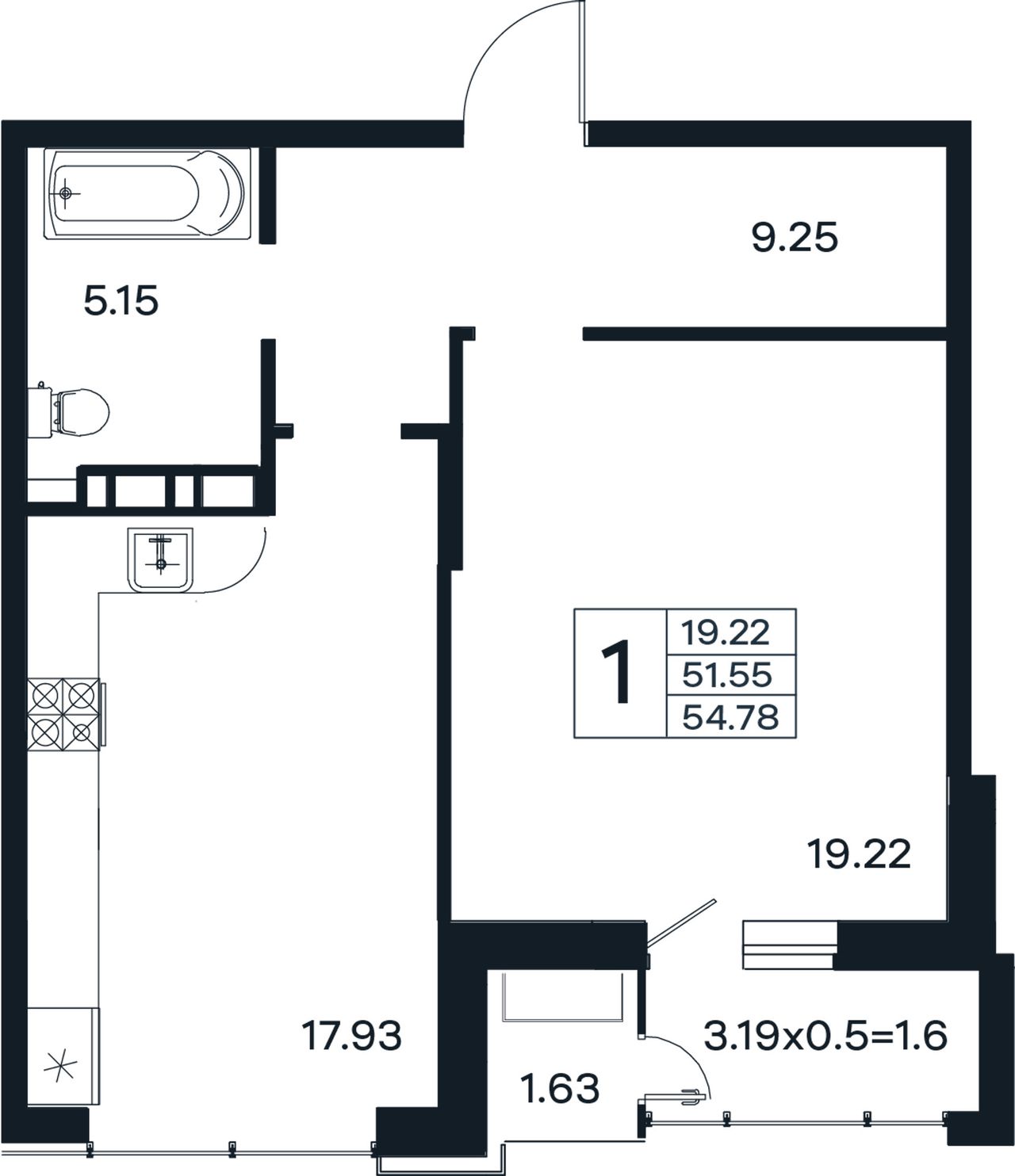 1-комнатная — 54,78 м² 3/12 эт. в ЭНДЕМИК