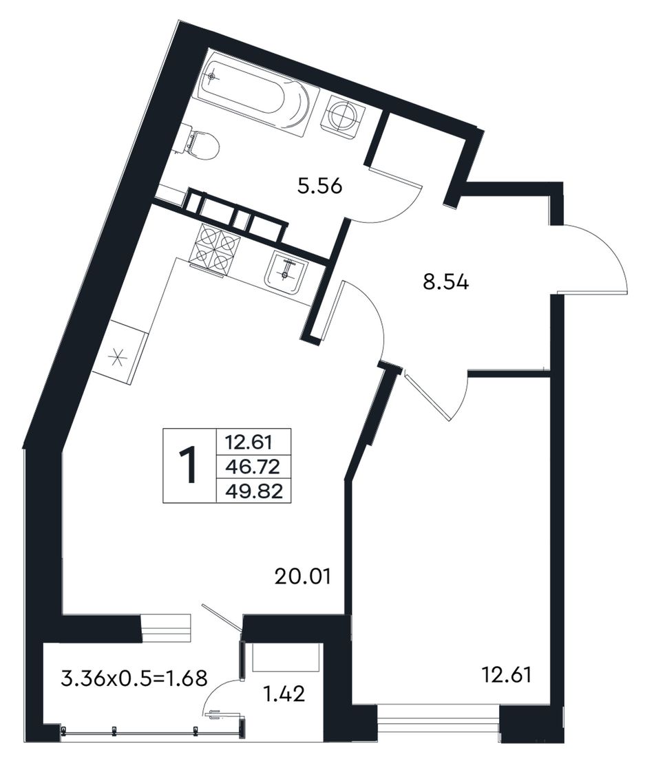 1-комнатная — 49,82 м² 2/12 эт. в ЭНДЕМИК