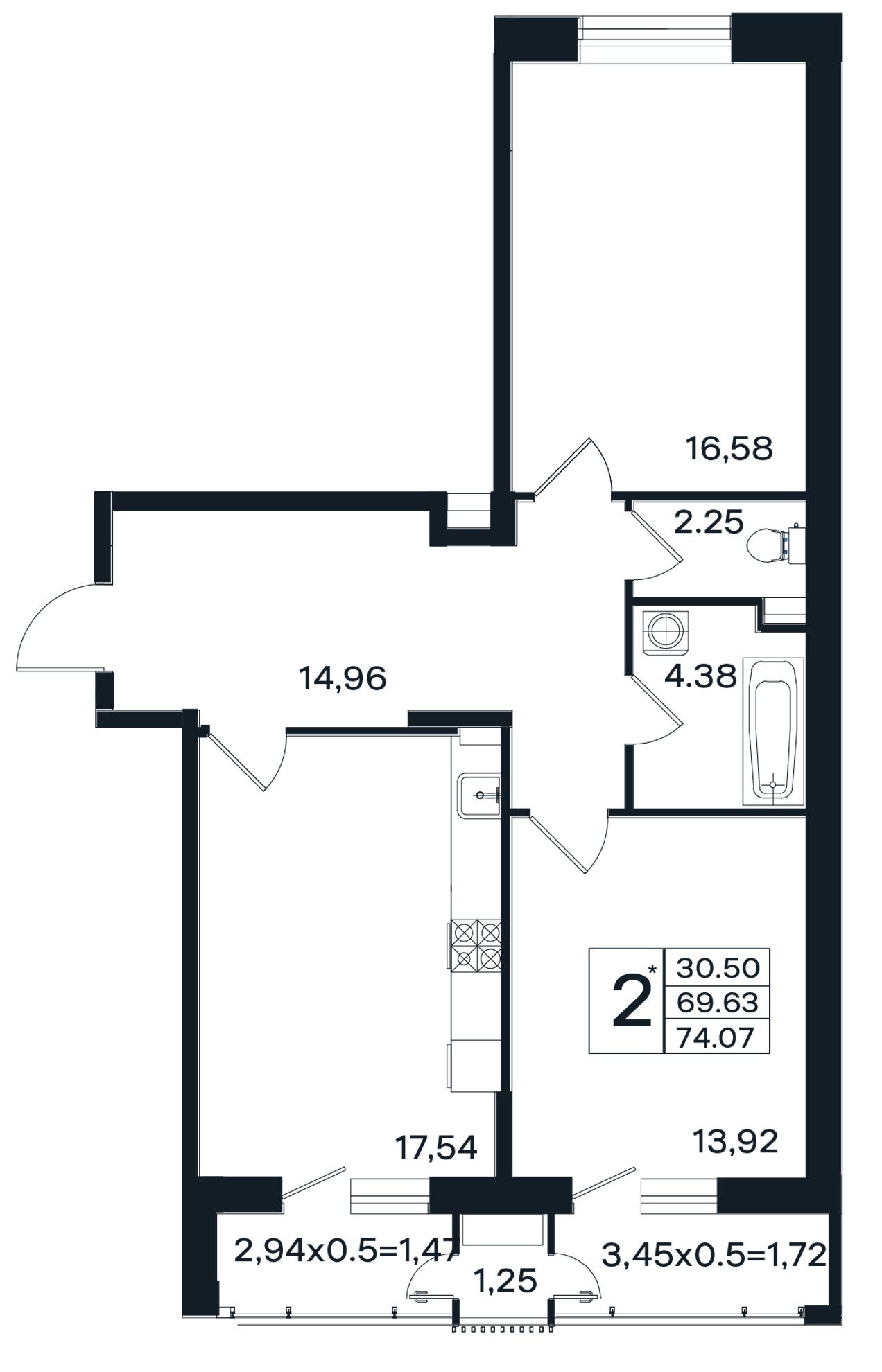 2-комнатная — 74,07 м² 1/12 эт. в ЭНДЕМИК