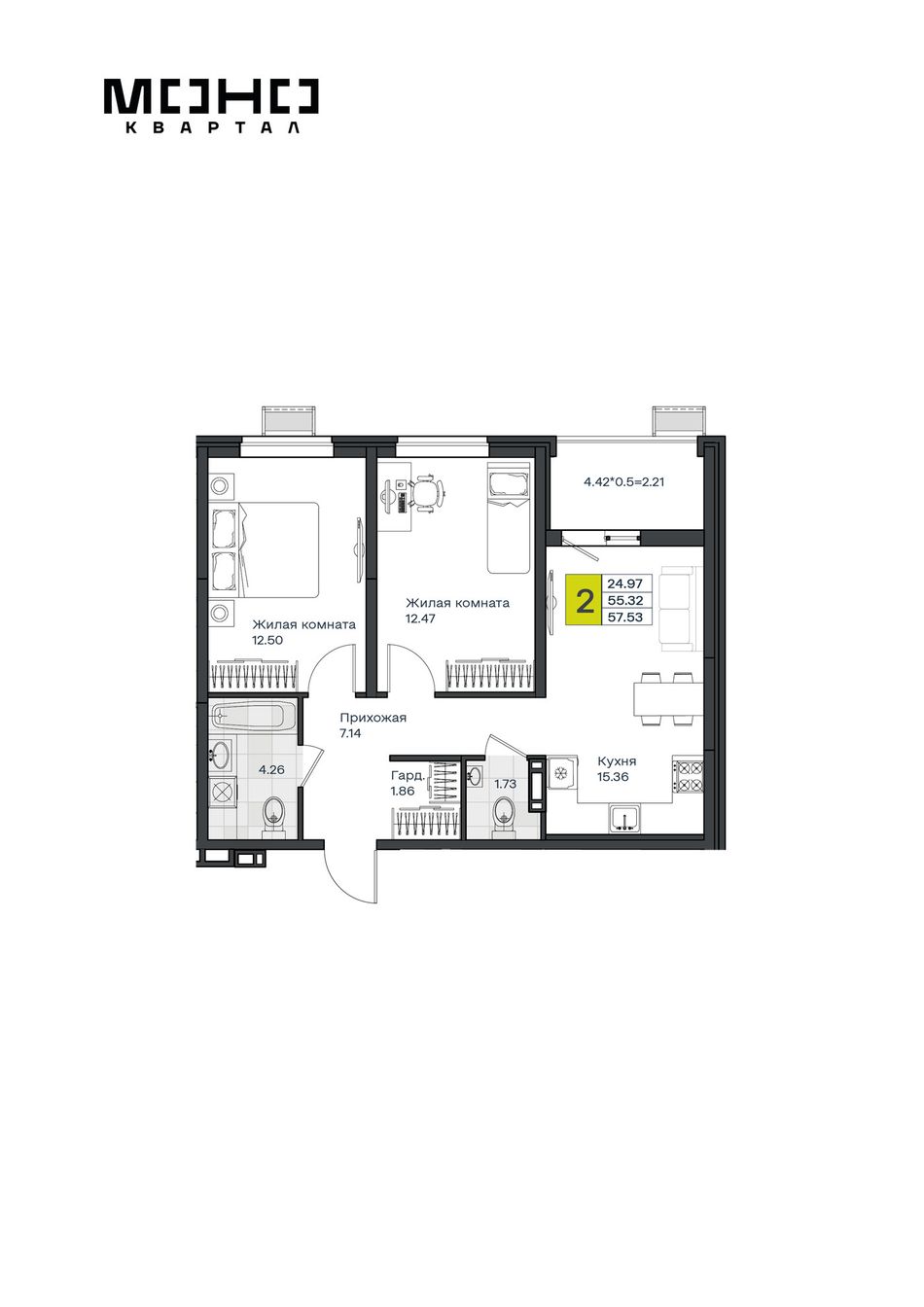 2-комнатная — 57,53 м² 8/8 эт. в МОНО Квартал