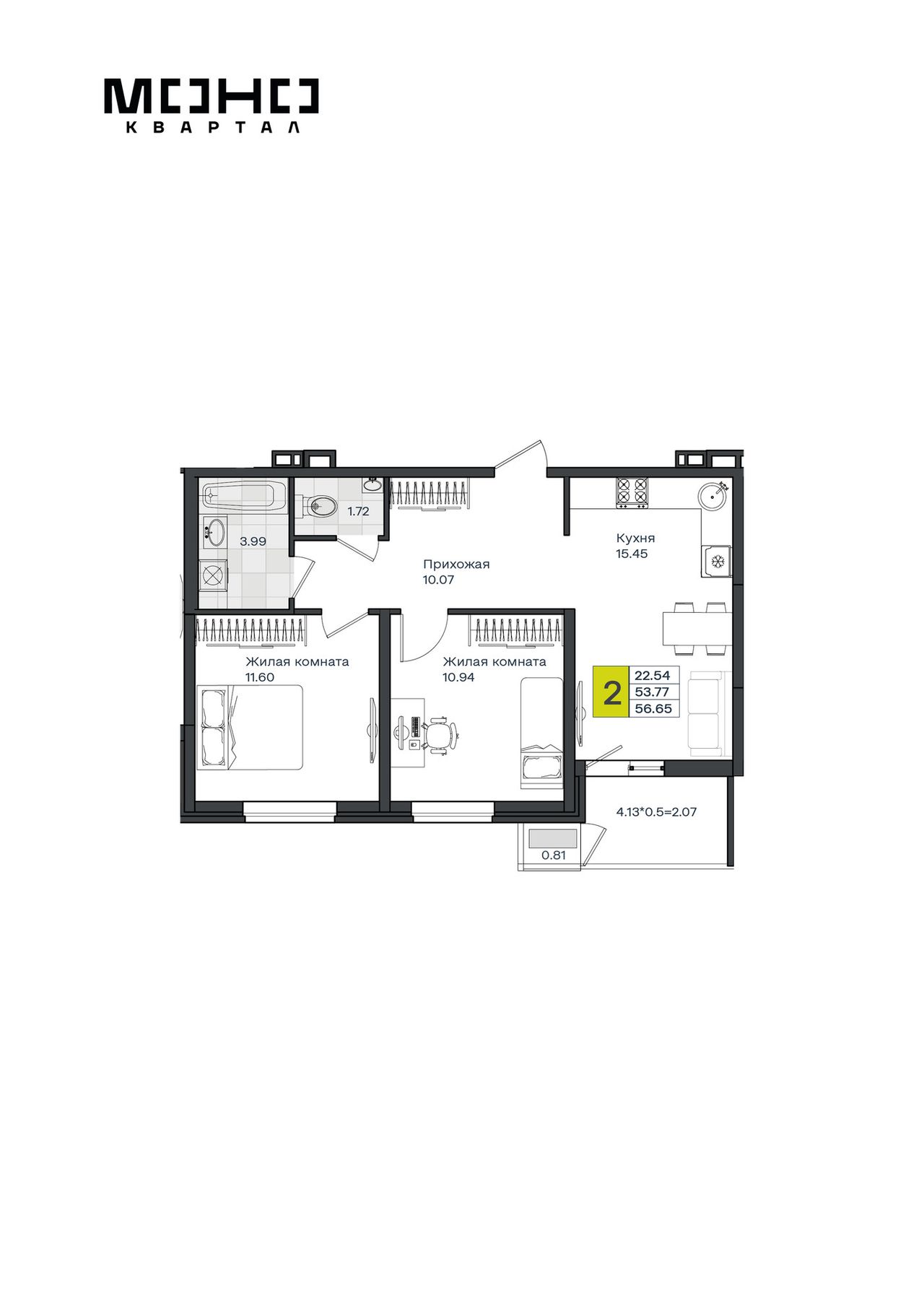 2-комнатная — 56,65 м² 8/8 эт. в МОНО Квартал
