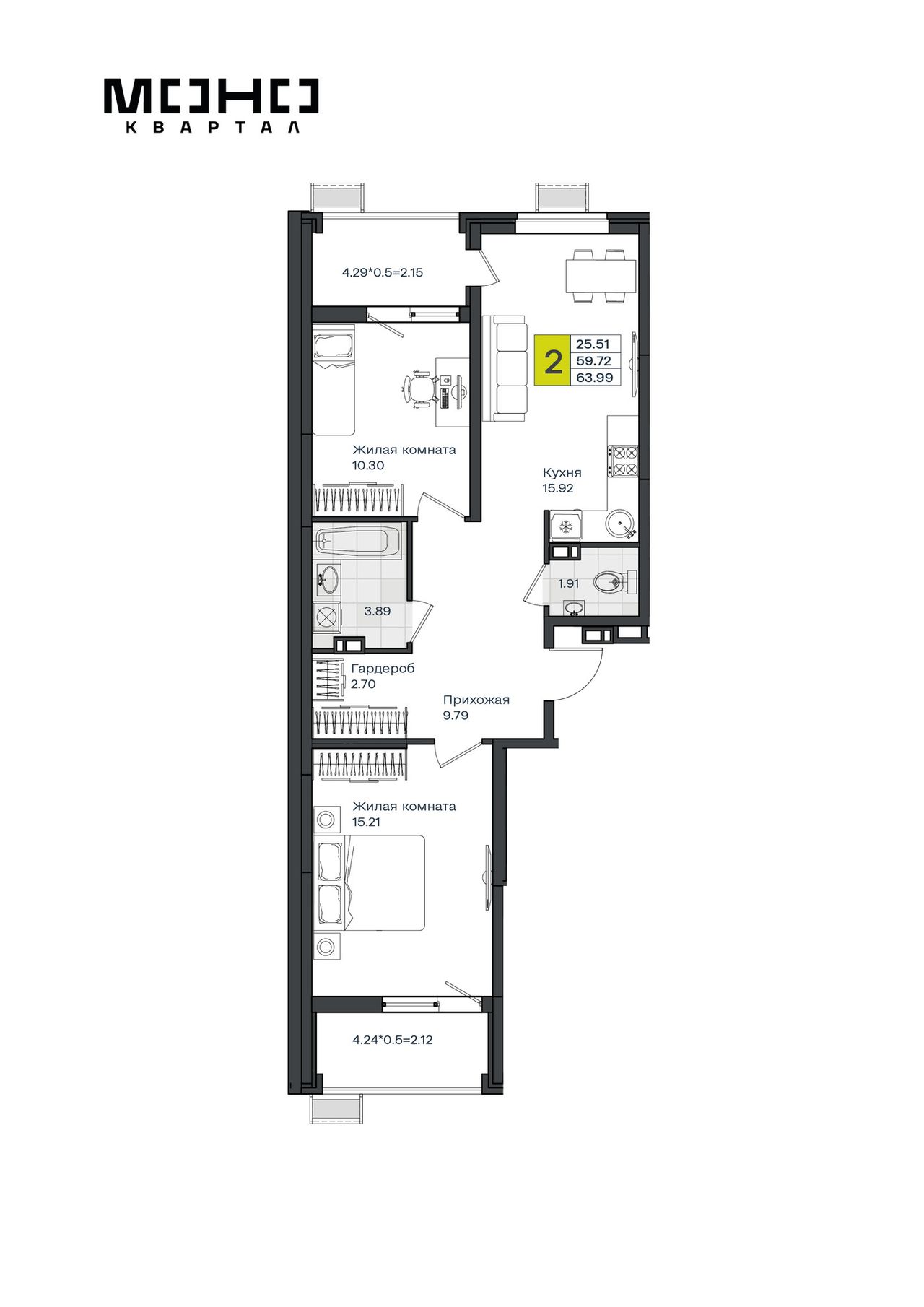 2-комнатная — 63,99 м² 8/8 эт. в МОНО Квартал