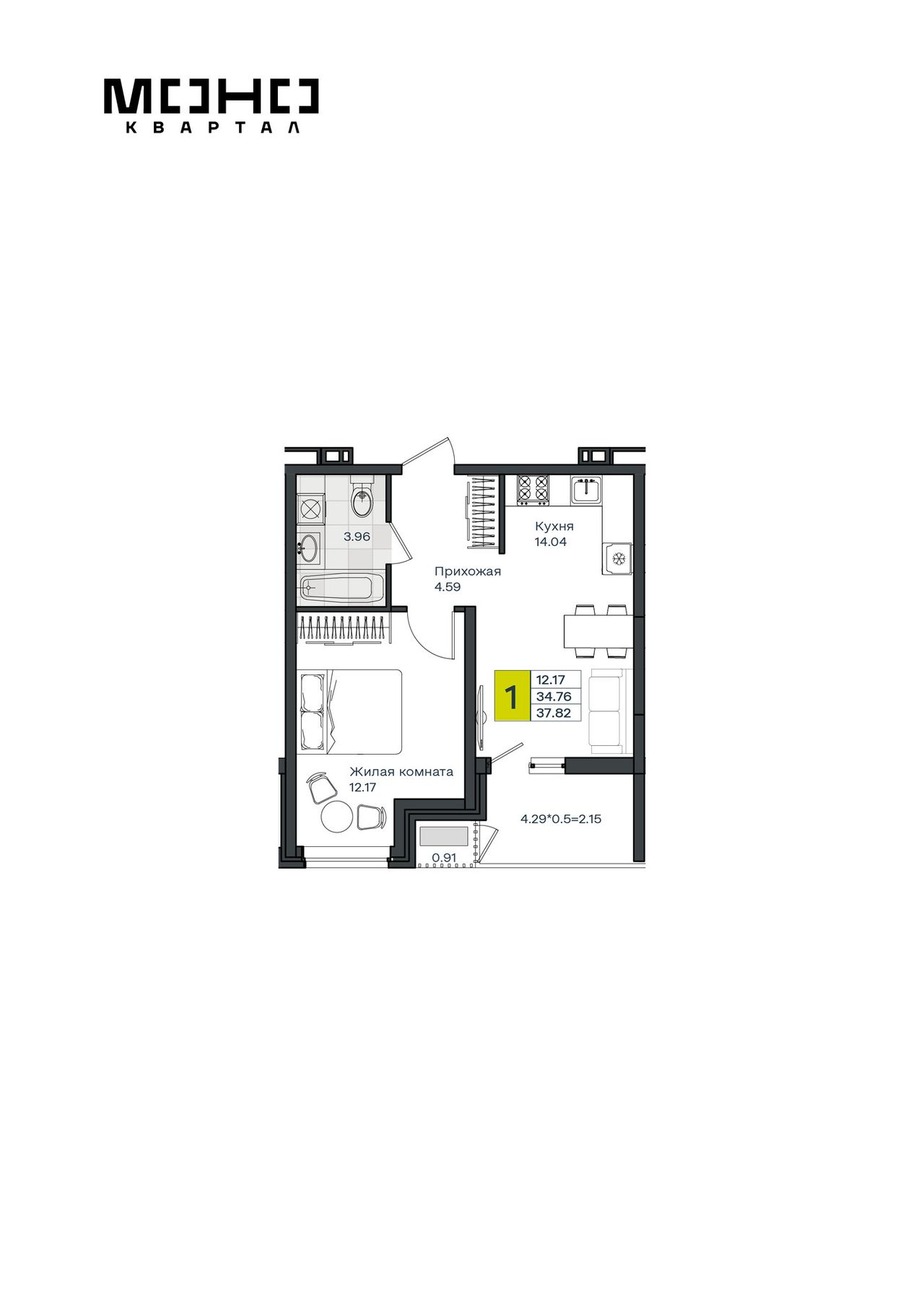 1-комнатная — 37,82 м² 6/8 эт. в МОНО Квартал