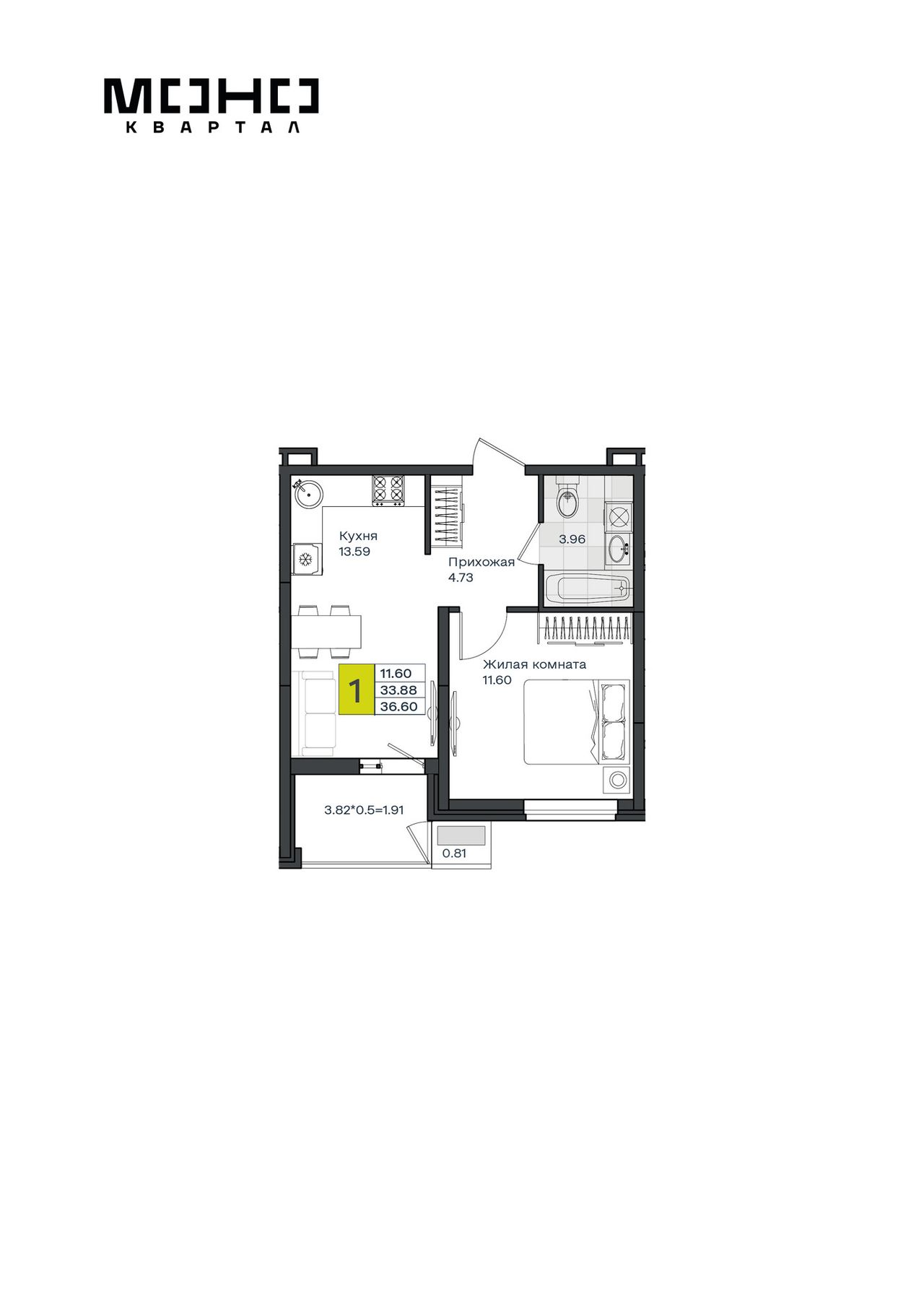 1-комнатная — 36,6 м² 2/8 эт. в МОНО Квартал
