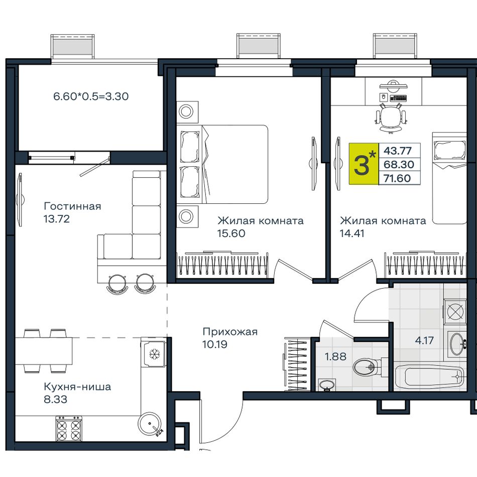 3-комнатная — 71,6 м² 2/8 эт. в МОНО Квартал