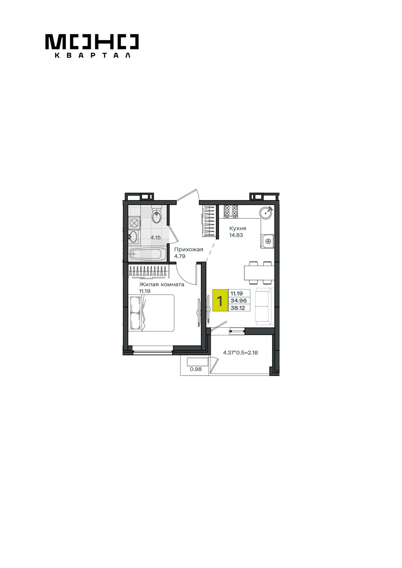 1-комнатная — 38,12 м² 8/8 эт. в МОНО Квартал