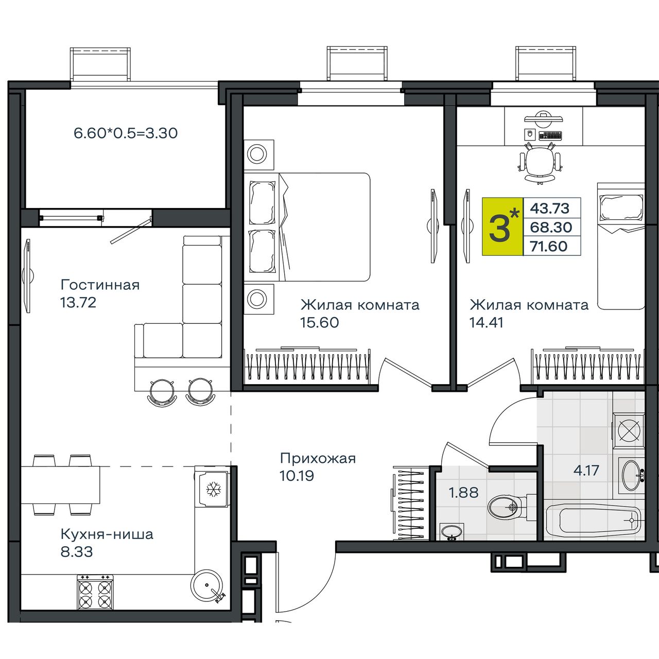 3-комнатная — 71,6 м² 8/8 эт. в МОНО Квартал