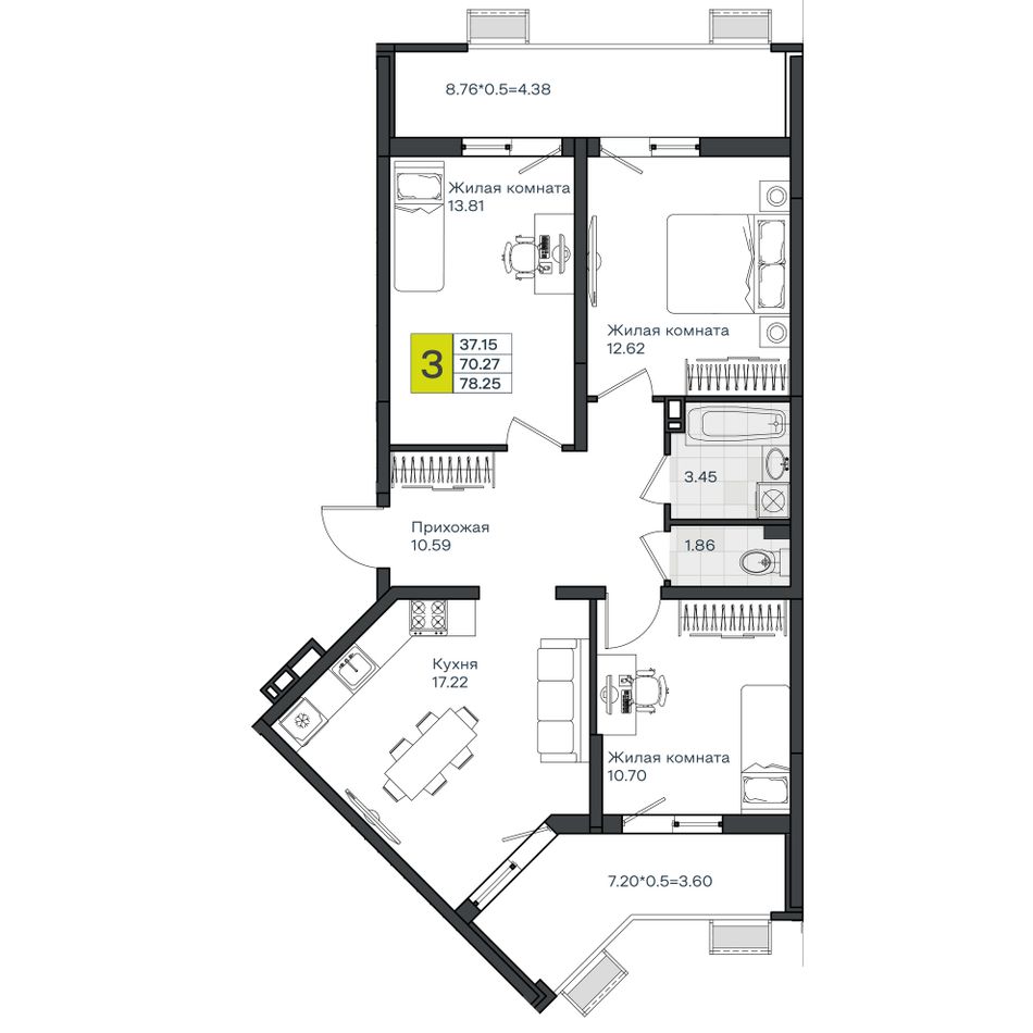 3-комнатная — 78,25 м² 8/8 эт. в МОНО Квартал