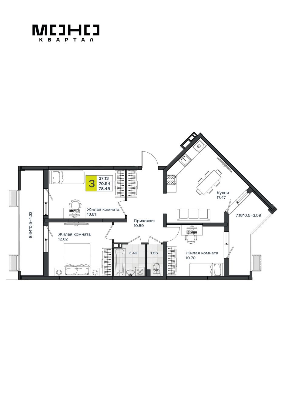 3-комнатная — 78,45 м² 8/8 эт. в МОНО Квартал