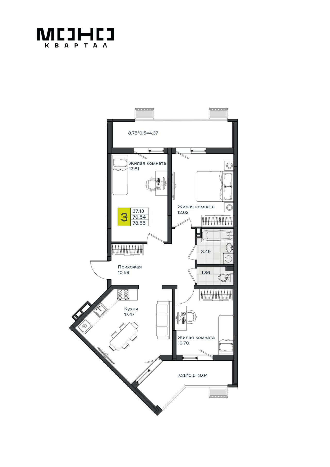 3-комнатная — 78,55 м² 7/8 эт. в МОНО Квартал