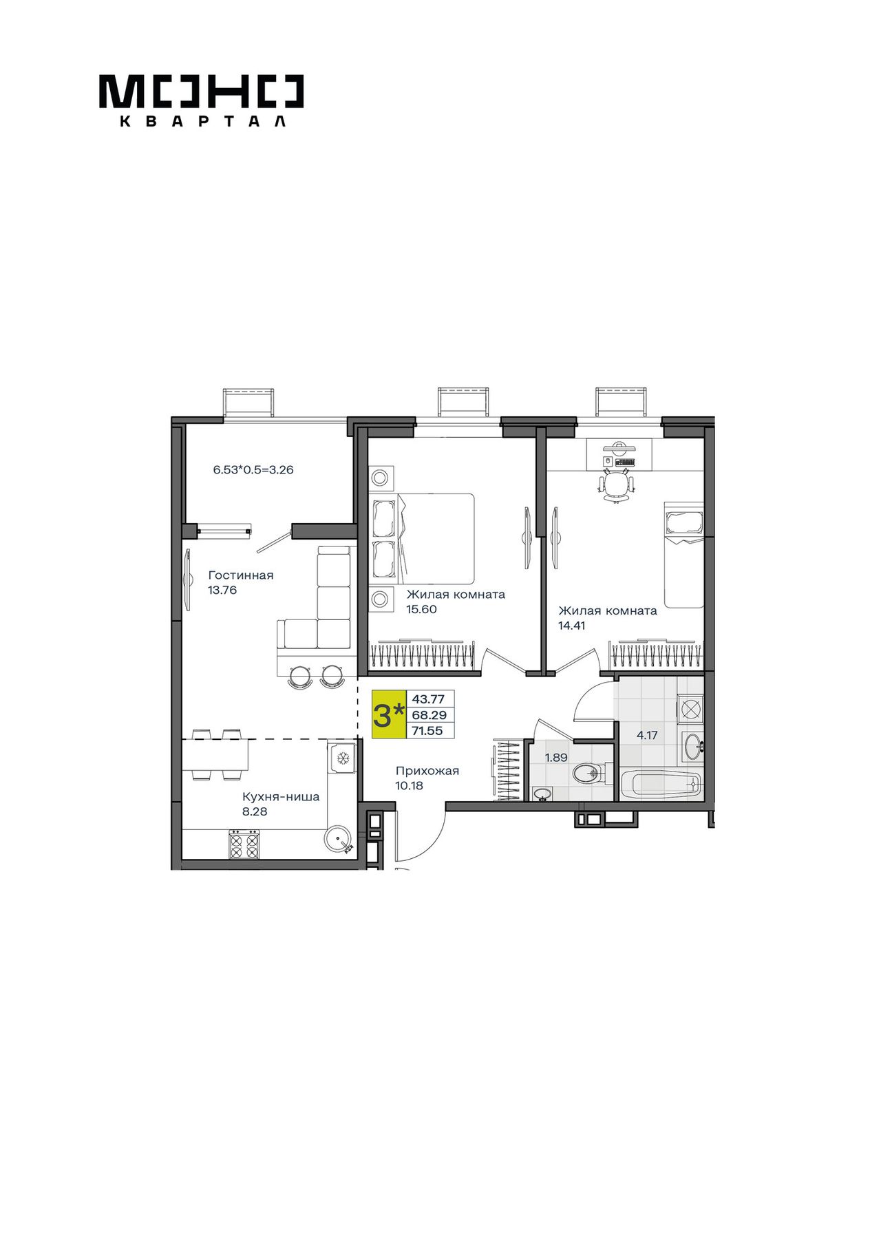 3-комнатная — 71,55 м² 4/8 эт. в МОНО Квартал