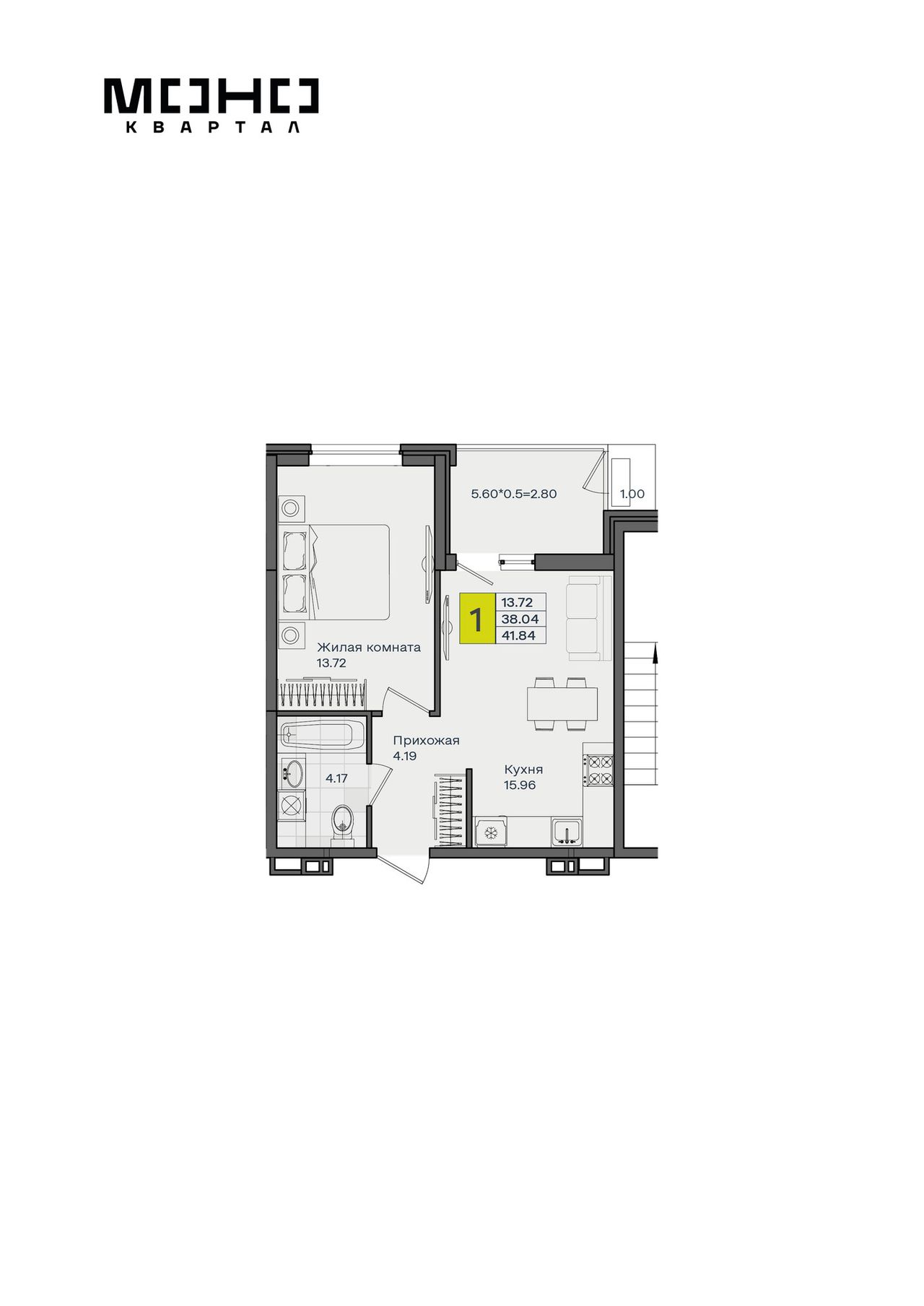 1-комнатная — 41,84 м² 4/8 эт. в МОНО Квартал