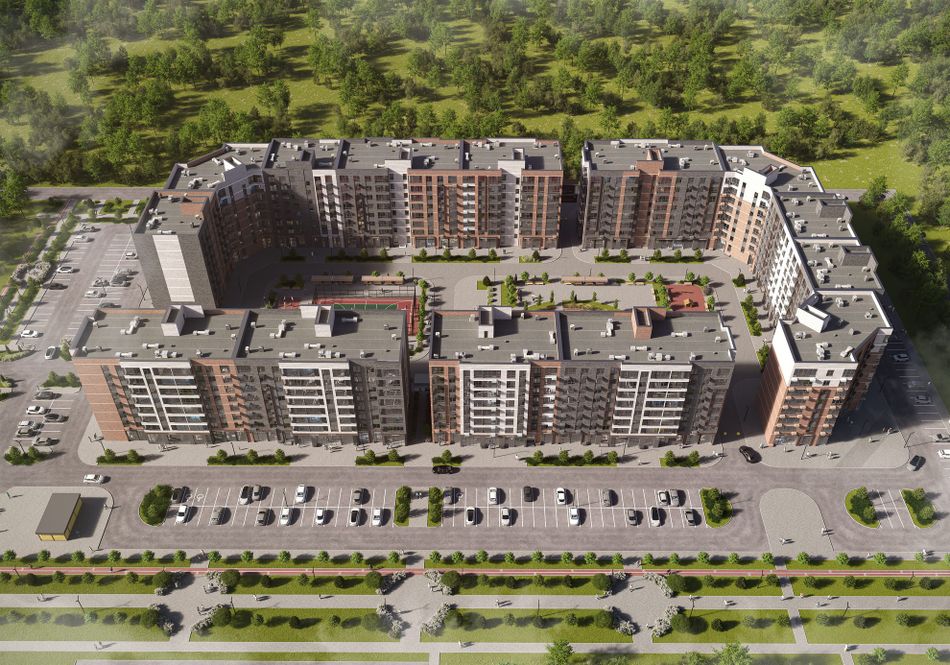 Новый проект строительства в пос. Березовый. Стильные фасады из керамического кирпича, зона коммерции, благоустроенные детские и спортивные площадки, ландшафтное озеленение.
