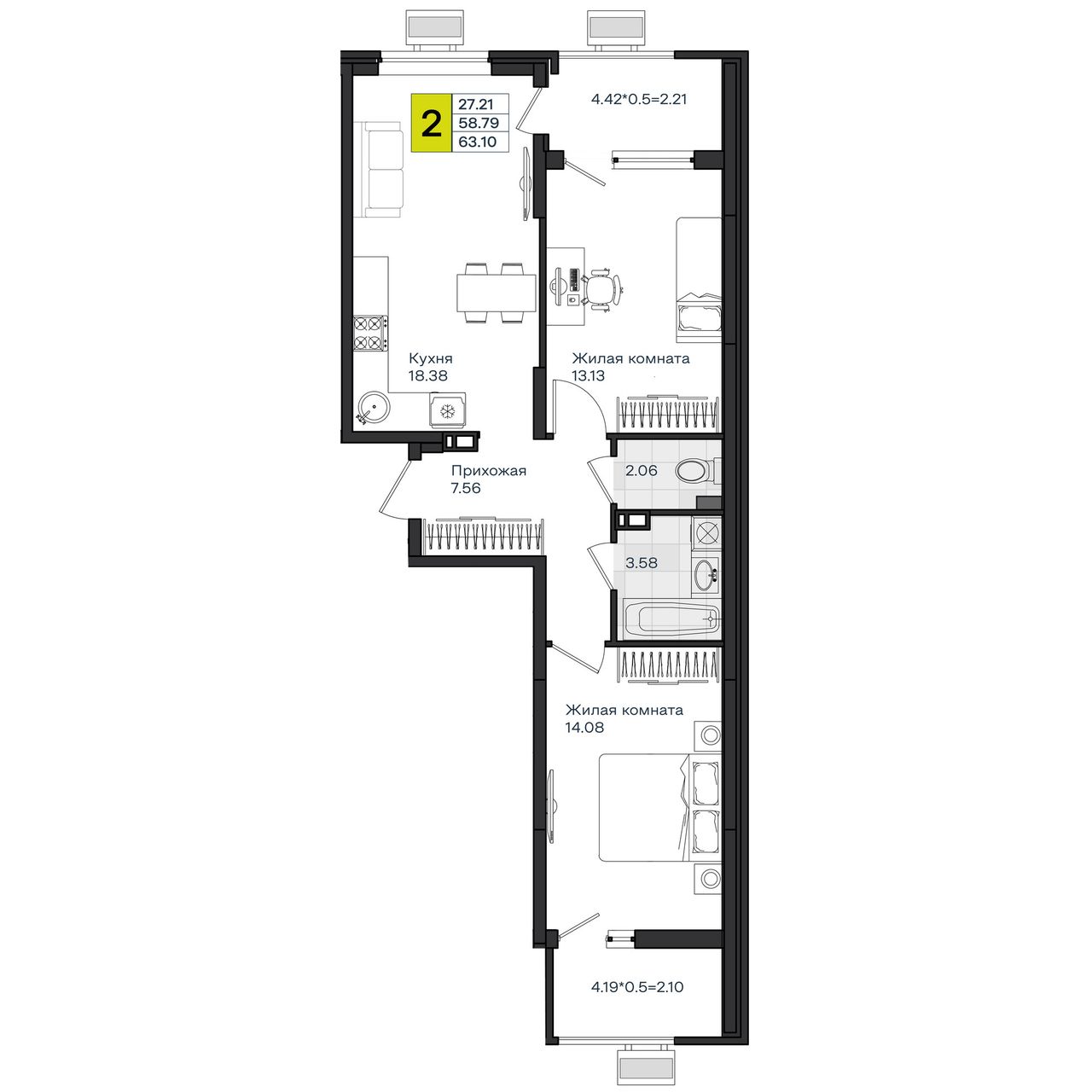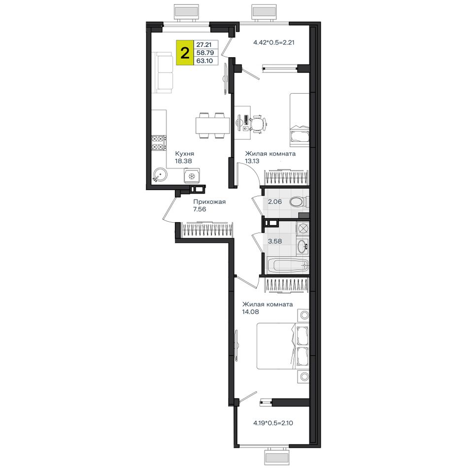 2-комнатная — 63,1 м² 6/8 эт. в МОНО Квартал