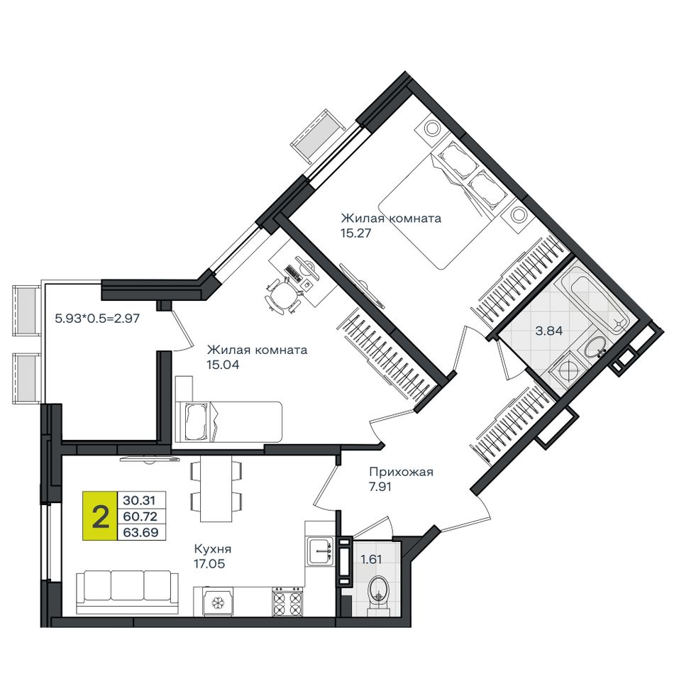 2-комнатная — 63,69 м² 6/8 эт. в МОНО Квартал