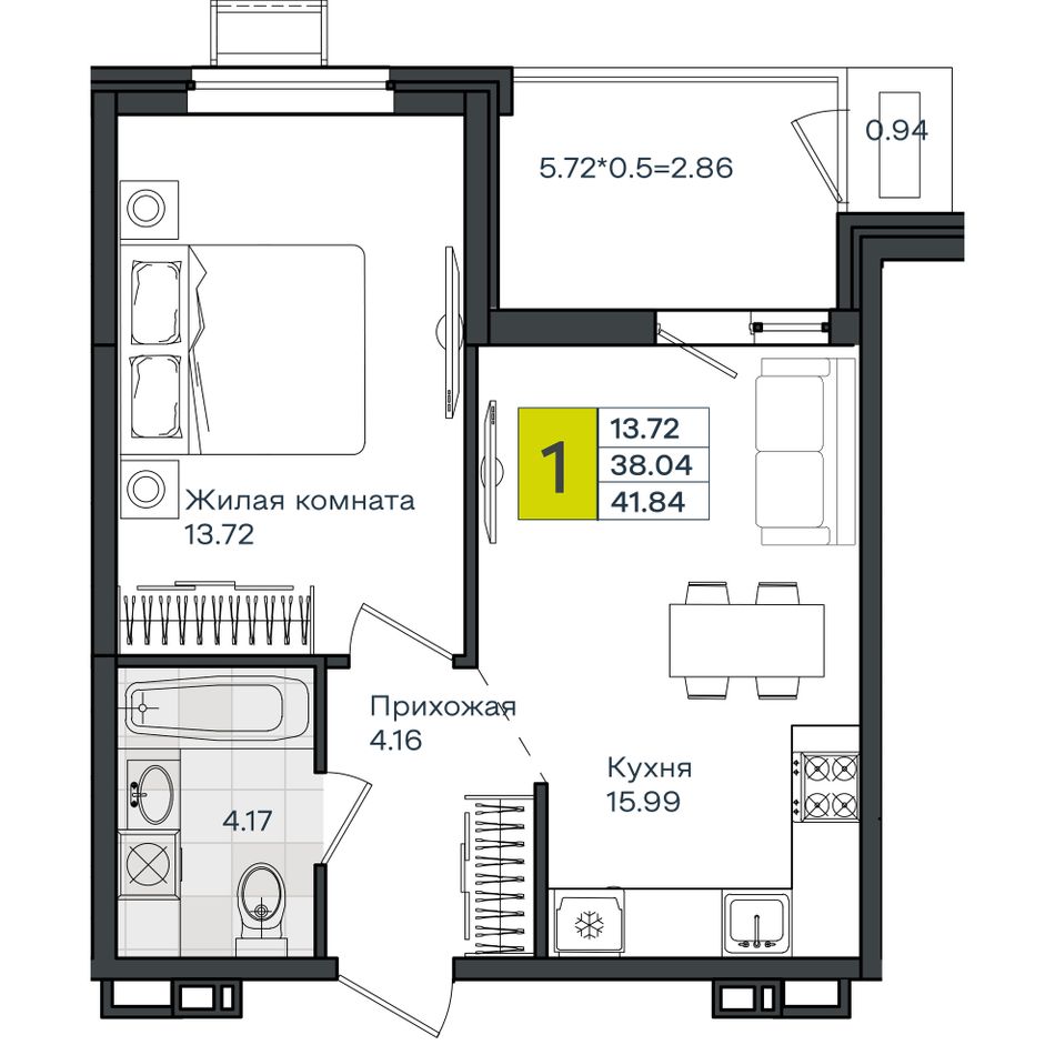 1-комнатная — 41,84 м² 5/8 эт. в МОНО Квартал