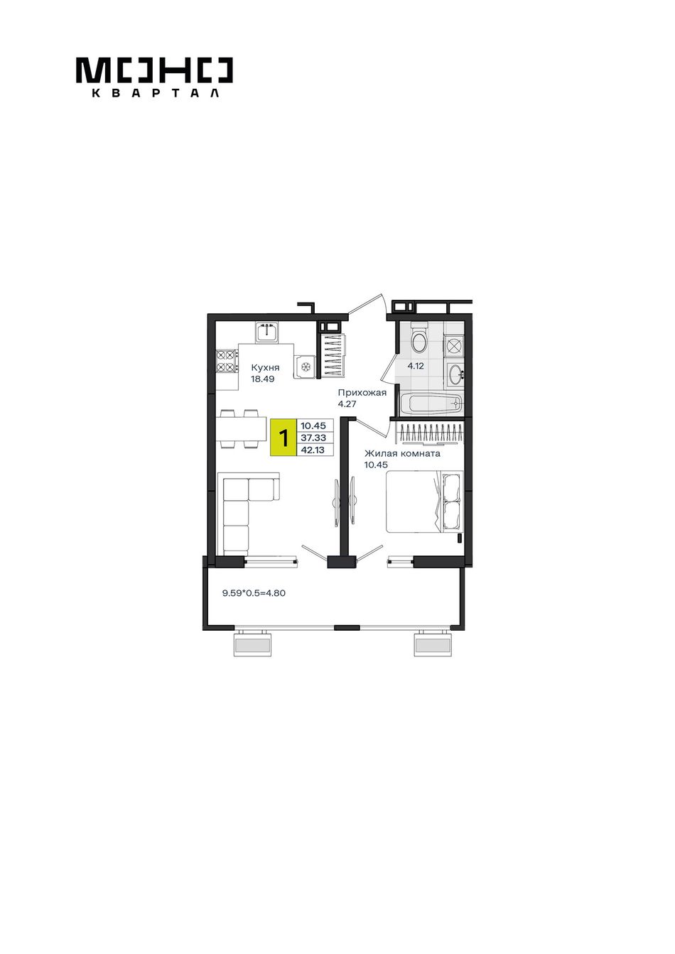 1-комнатная — 42,13 м² 5/8 эт. в МОНО Квартал